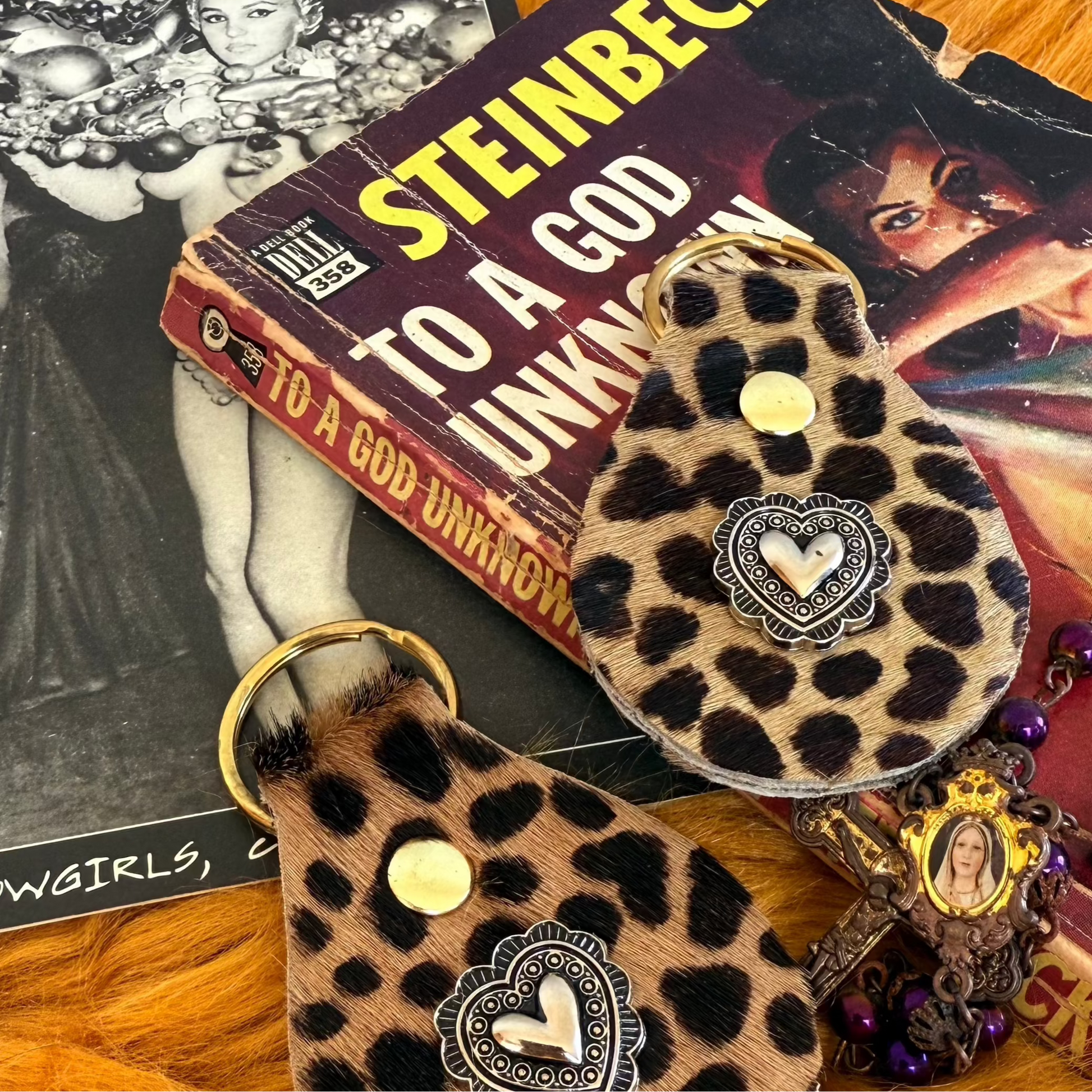 Exquisitely crafted from 100% repurposed hide, this distinctive key ring showcases the natural beauty of hair-on leather, adorned with an elegant heart concho detail. Each piece celebrates the untamed character of the original material while transforming it into functional art, a sophisticated accessory that combines rustic luxury with sustainable craftsmanship.